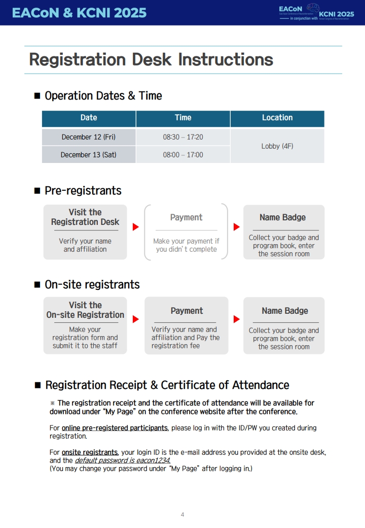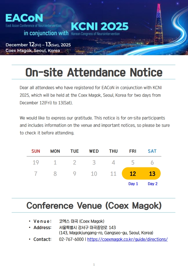 What's New Attendance Guideline Date : 2025-12-10 Hits : 95 EACoN KCNI 2025 Attendance Guideline.pdf (다운로드 : 1,301회) EACoN KCNI 2025 현장참석 안내문.pdf (다운로드 : 1,295회) List